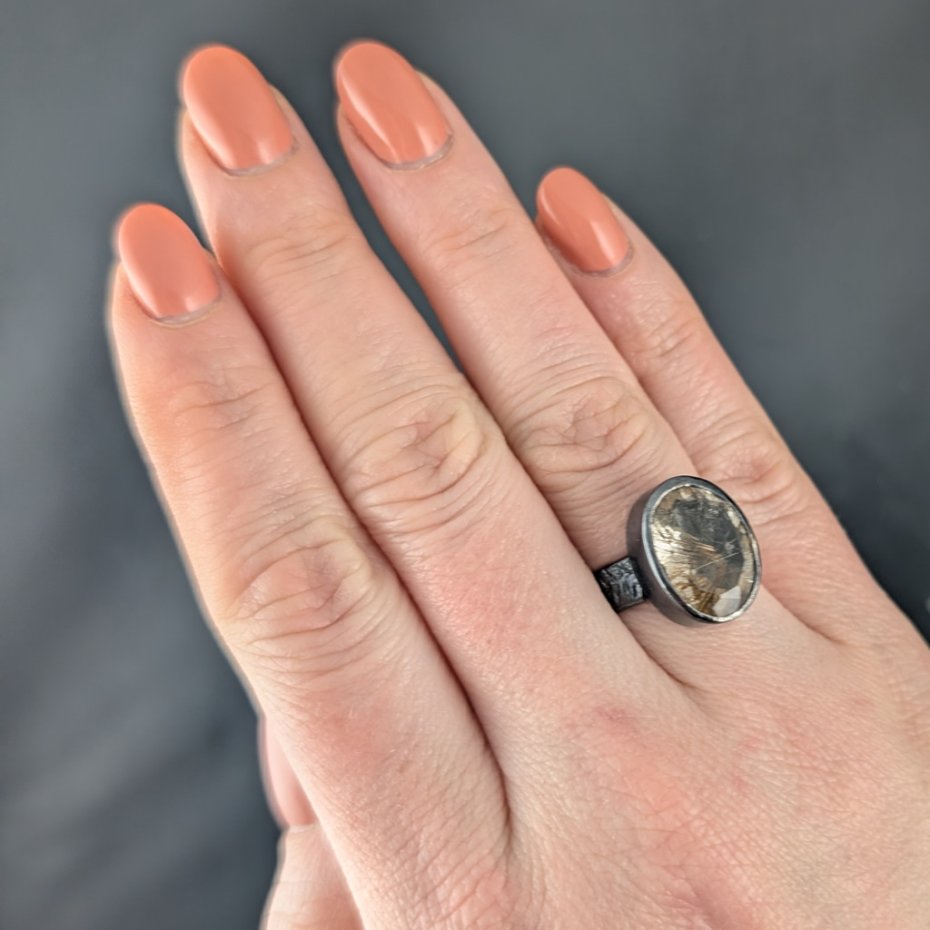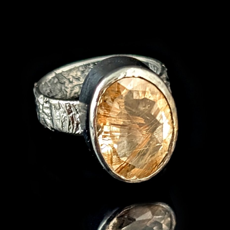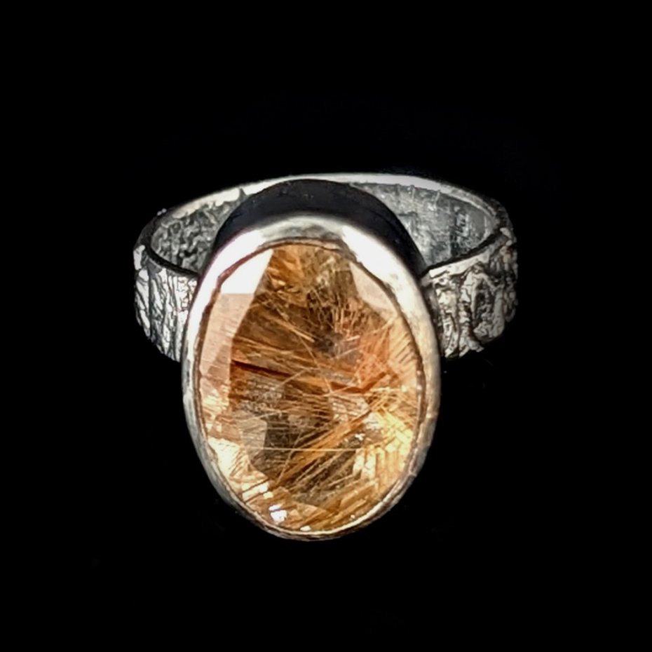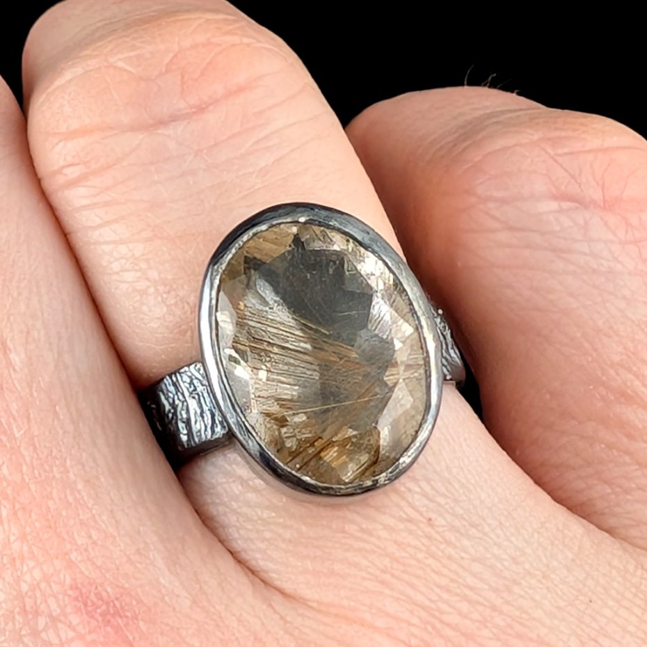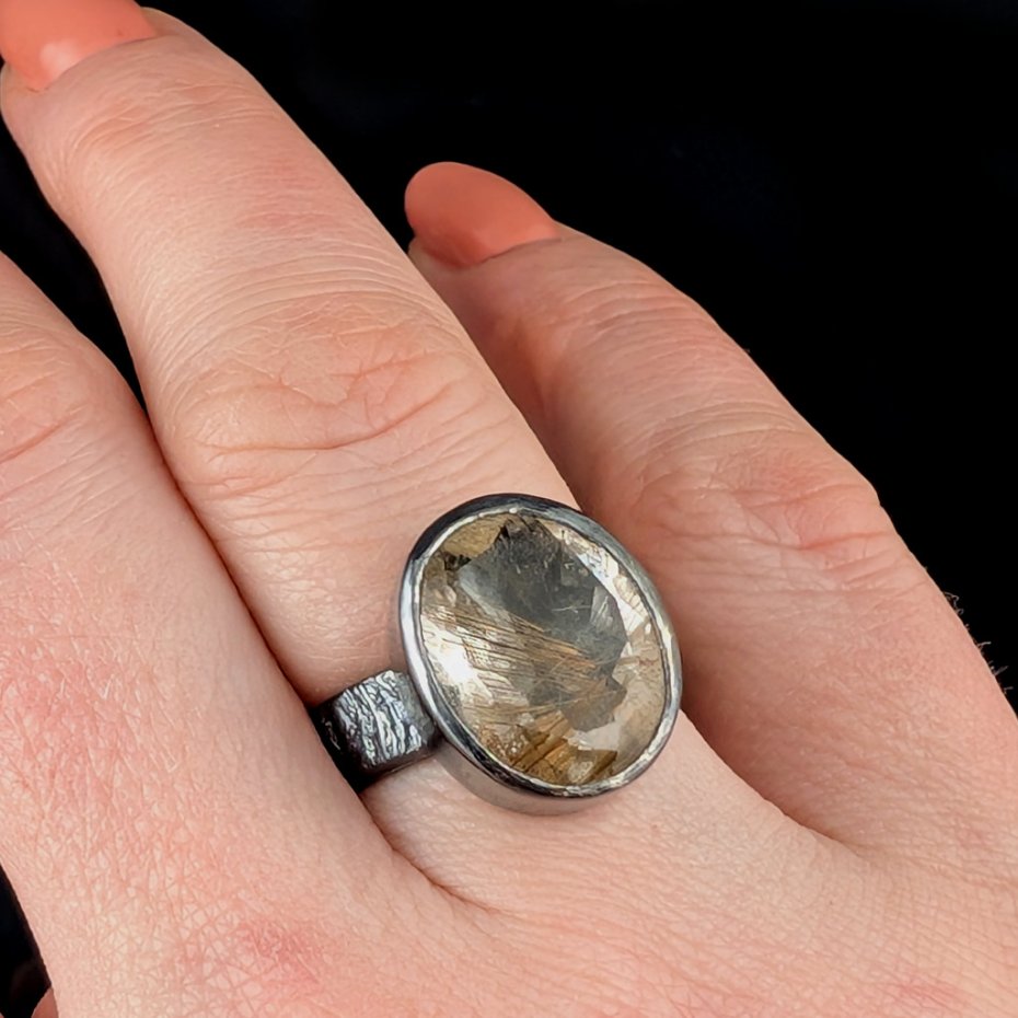 Piękny kwarc z licznymi inkluzjami rutylu w surowej oprawie oksydowanego srebra próby 925. Takie inkluzje w kwarcu zwane są włosami Wenus. Wymiary oprawy 17 x 13 mm, rozmiar jubilerski 15, obrączka ma 5 mm szerokości. Bez zmiany rozmiaru. Polecam, wyjątkowy pierścień. Waga 7 g. Pierścionek zostanie zapakowany w ozdobne pudełeczko.