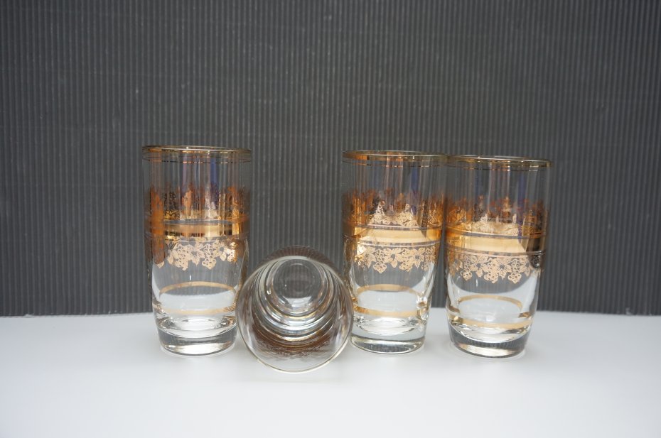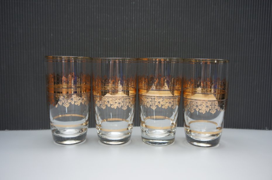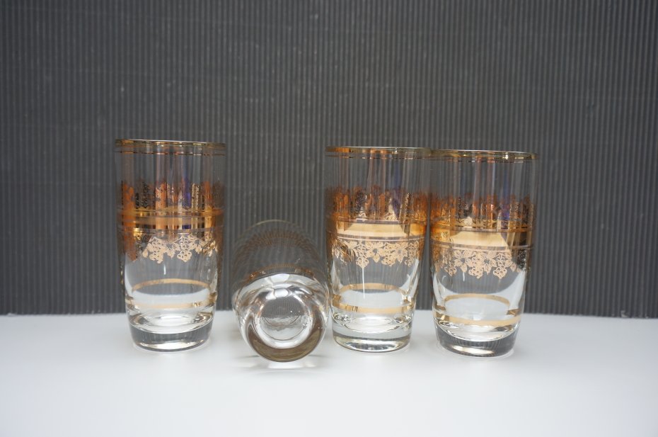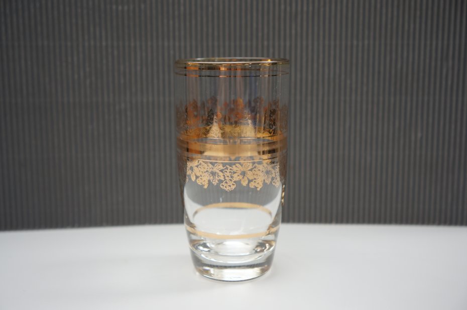 Zestaw czterech sztuk szklanek / literatek. Przezroczyste szkło, o cylindrycznym kształcie, lekko zwężającym się ku dołowi. Grube dno. Na literatkach bogate, złote zdobienia. Przedmiot z wczesnych lat 70. Delikatne przetarcia na złotym, górnym pasku. Mimo upływu lat stan bardzo dobry.