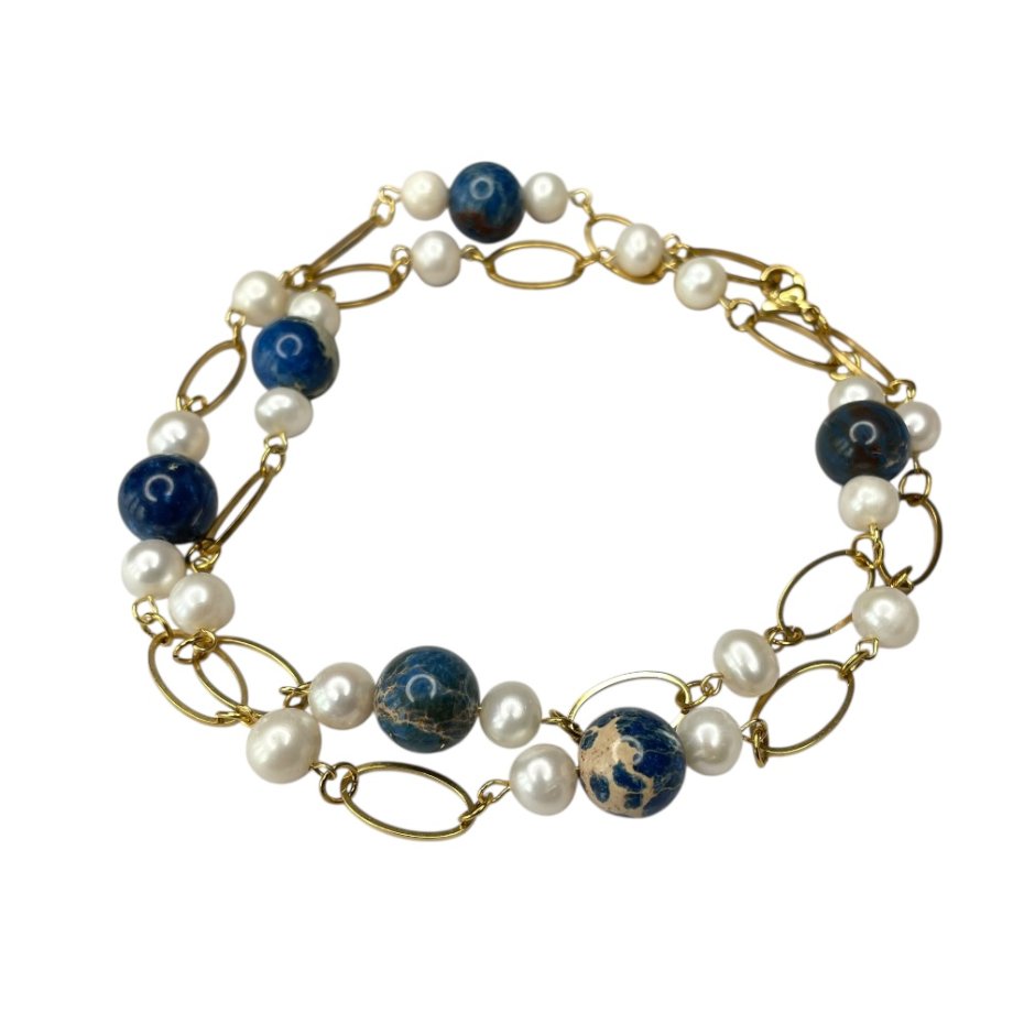 Naszyjnik z jaspisami cesarskimi i naturalnymi perłami to elegancka kompozycja, w której klasyka spotyka się z nowoczesną formą. Owalne, złocone ogniwa łączą większe kamienie jaspisu z delikatnymi perłami, tworząc rytmiczną, harmonijną całość. Kontrast gładkich, jasnych pereł z wyrazistą strukturą jaspisu nadaje biżuterii charakteru, a pozłacane elementy subtelnie podkreślają jej szlachetny styl. To naszyjnik, który sprawdzi się zarówno jako mocniejszy akcent codziennej stylizacji, jak i eleganckie dopełnienie bardziej klasycznego zestawu.