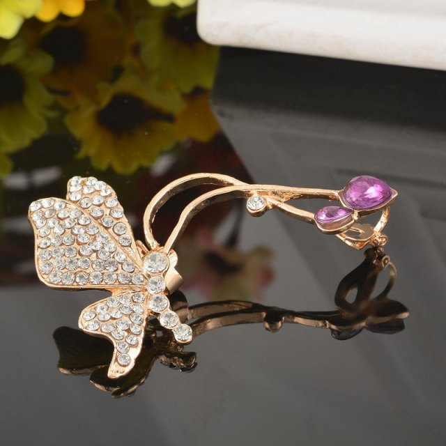 Piękna nausznica w kolorze złota wysadzana białymi cyrkoniami, u dołu dwie fioletowe kropelki.