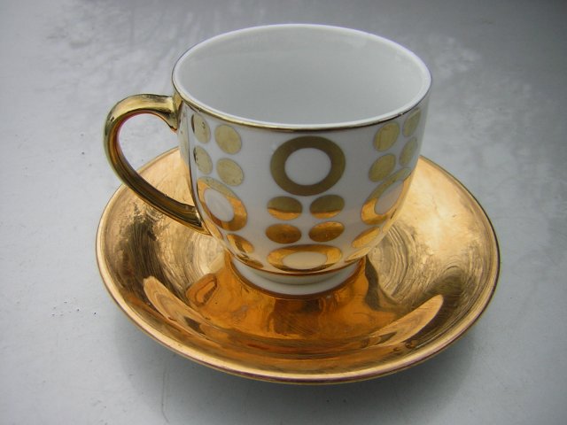 Zestaw złoconej porcelany. Filiżanka sygnowana Elypso, mocna, solidna...wielkość na espresso. Zdobienie na bieli graficzne koła i okręgi. Wykończenie satynowo - błyszczące. Spodek z napisem Foreign 50 / znaczy wykonano poza terytorium Wielkiej Brytanii /. lżejszy, delikatniejszy, równie dźwięczny ...z motywem kola i okręgu w spokojnej już odsłonie. Odcienie złota na filiżance nieco się różnią, wszak nie jest to komplet. Filiżanka ma odcień złota ciut chłodniejszy.