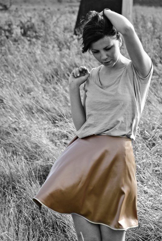 Spódniczka wykonana została z brązowo-złotej błyszczącej satyny. Krojona z koła, zapinana na zamek kryty oraz ozdobny złoty guziczek, wykończona złotą lamówką. Rozmiar M