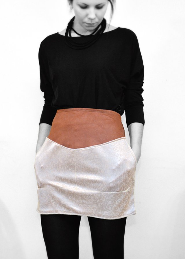 Spódniczka wykonana została z brązowego materiału przypominającego zamsz i kremowo-złotej połyskującej dzianiny. Prosty fason, spódniczka dopasowana w pasie, z kieszeniami po bokach, z tyłu zapięcie na zamek. Rozmiar M