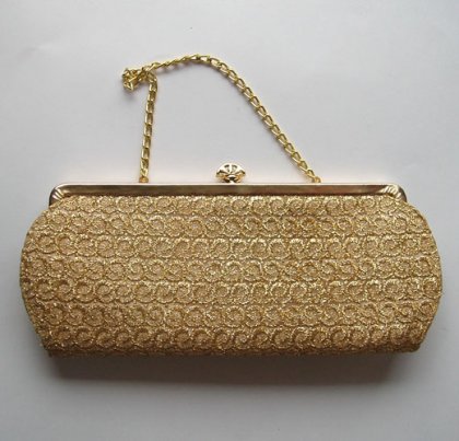 Elegancka torebka wieczorowa ze złotym ornamentem. Złocony bigiel oraz łańcuszek dł. 30cm. W środku kremowa podszewka oraz kieszonka na zamek. Szer. do 30 cm, wys. 12cm. Stan bardzo dobry.