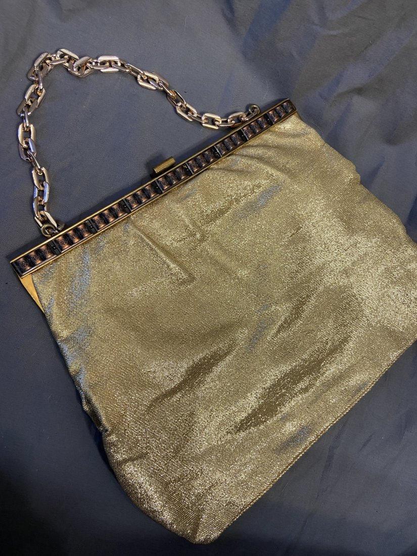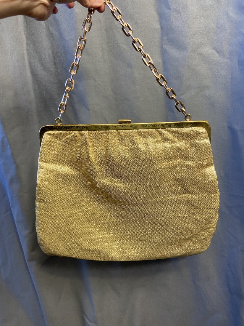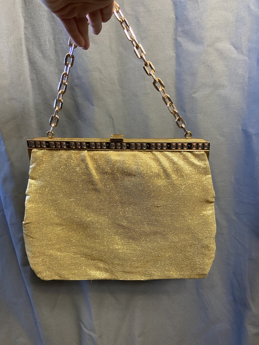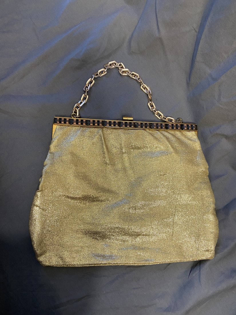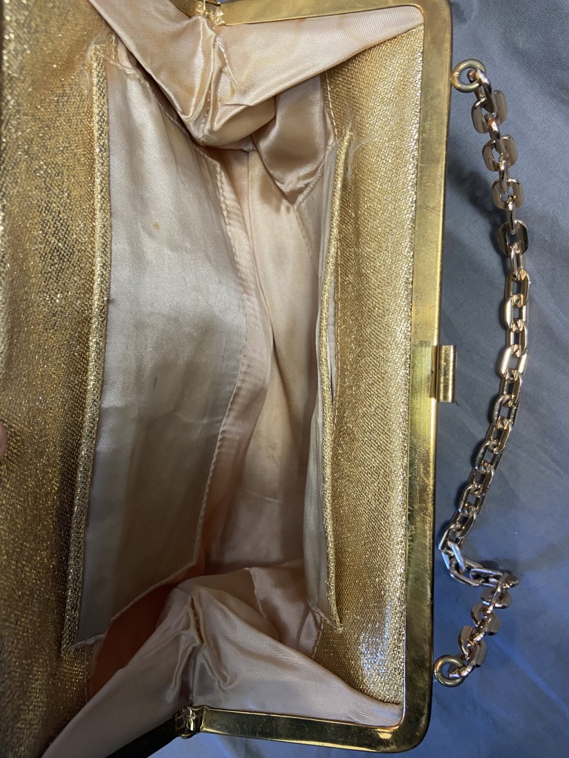 Torebka vintage. Złota. W necie datowanie znalazłam na lata 40-50te, w szalonych cenach. Wersja duża! Można zabrać wszystko co potrzeba, a nawet kiecę na zmainę. Środek satynowy, do doczyszczenia.