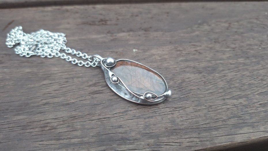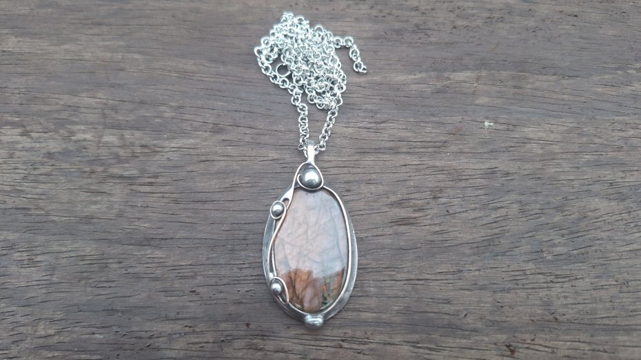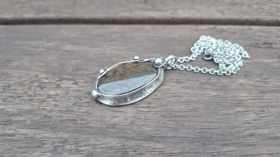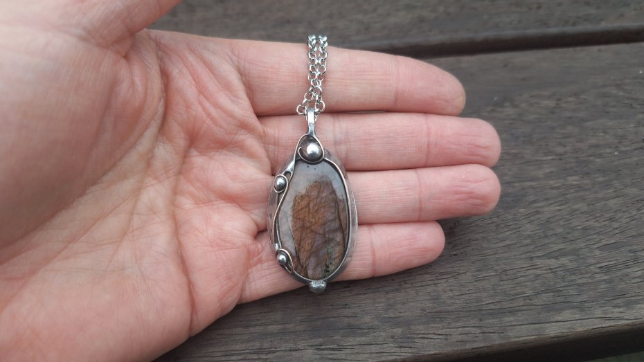 Wisiorek wykonany z miedzi, cyny i labradorytu. Wymiary ok. 4 na 2.2 cm. Zawieszony na łańcuszku o długości ok. 50 cm.