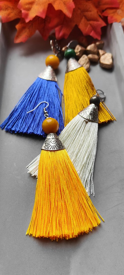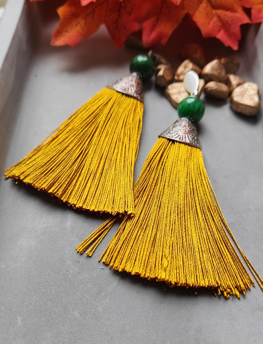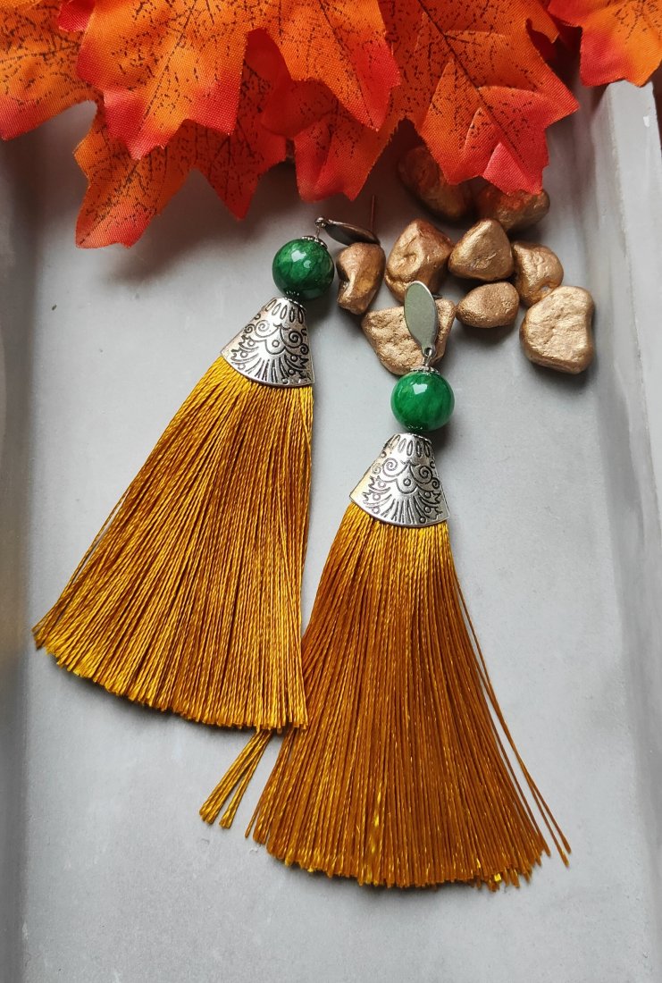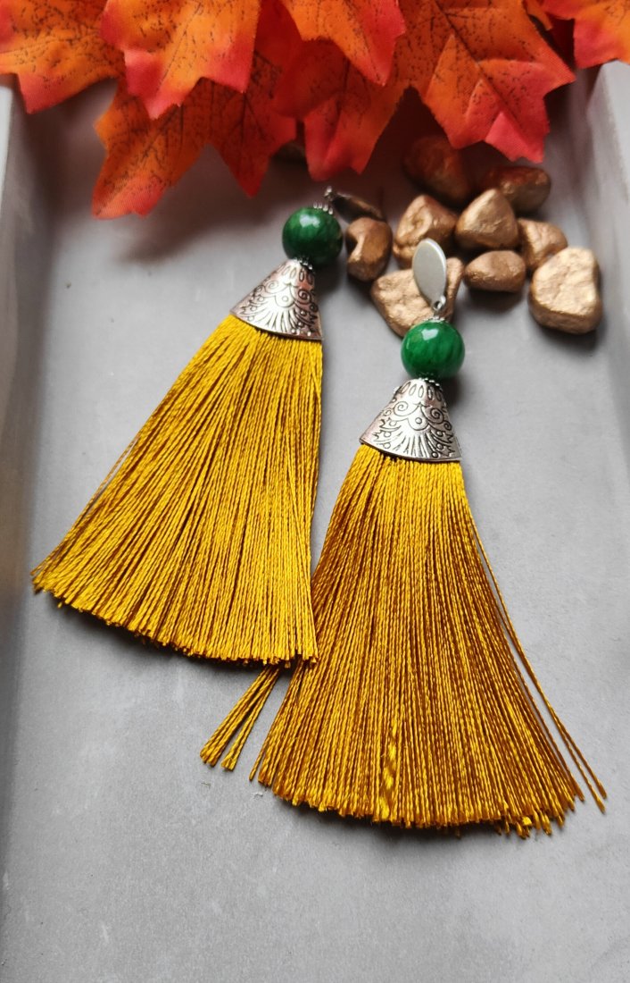 ,,złote frędzle,, to długie wiszące kolczyki wykonane z chwosta w kolorze złota i zielonego szklistego marmuru. Kolczyki zawieszone są na ozdobnych biglach typu sztyft wykonanych ze stali szlachetnej.