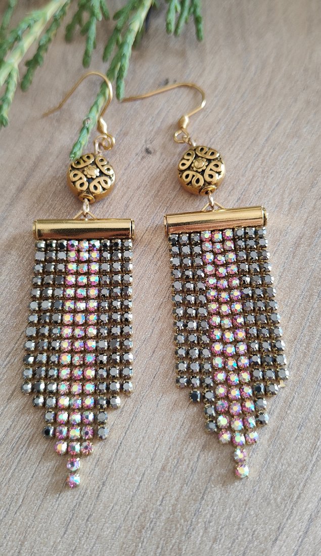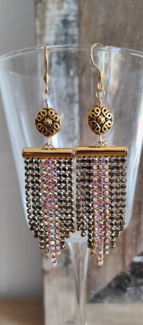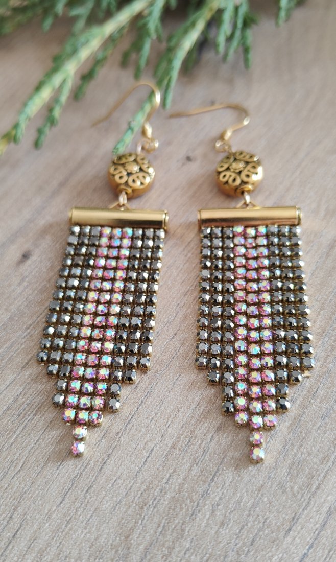 ,, złote frędzle,, to oryginalne wiszące kolczyki wykonane z taśmy cyrkoniowej w czarnym i różowym odcieniu. Kolczyki zawieszone są na klasycznych biglach w kolorze złota wykonanych ze stali szlachetnej.