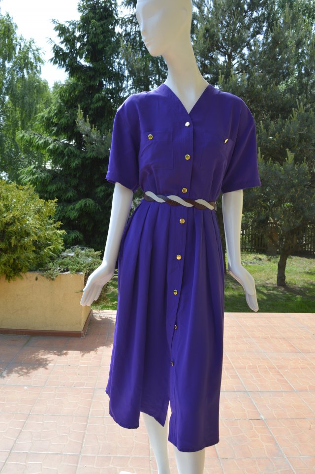 Fioletowa sukienka, delikatnie plisowana na dole. Pasek na zdjęciu nie podlega sprzedaży.