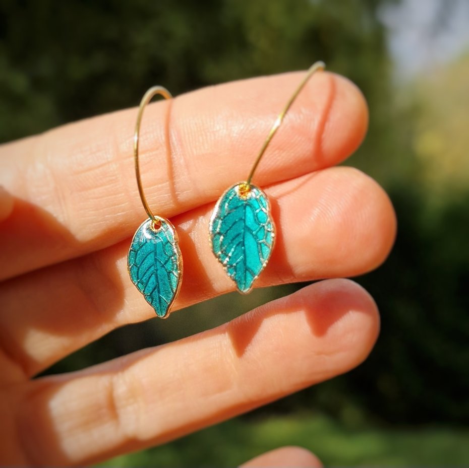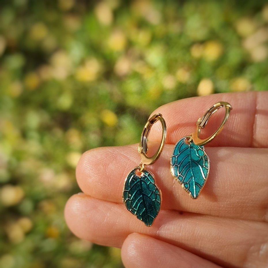 Listki ręcznie malowałam żywicą jubilerską epoksydową z dodatkiem pigmentów i proszku luminescencyjnego przeznaczonych do biżuterii.