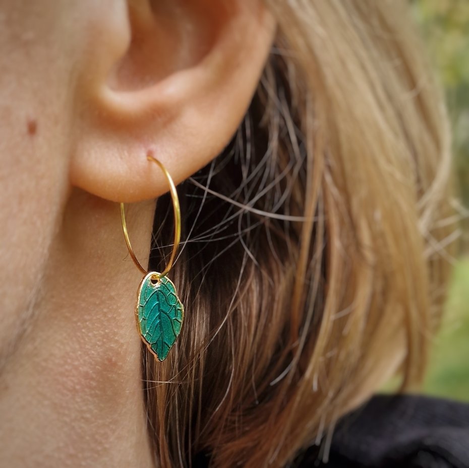 Lekkie kolczyki na kółkach z listkami stworzone dla Kobiety, która lubi kiedy w uszach kołyszą się minimalistyczne ozdoby. Te listki urocze same w sobie mają drugą naturę - po nakarmieniu słońcem delikatnie rozświetlą się w ciemności. :)