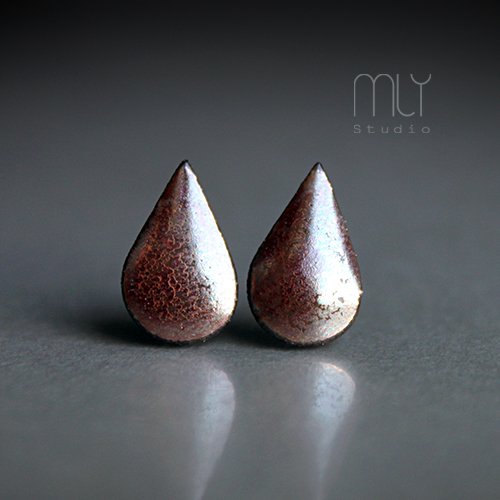 Oryginalne ceramiczne kolczyki w formie sztyftów, ręcznie wykonane z delikatnej gliny kamionkowej, jednostronnie szkliwione złotobrązowym szkliwem z efektem plamek, na antyalergicznych sztyftach w kolorze srebrnym. Długość ok 13mm