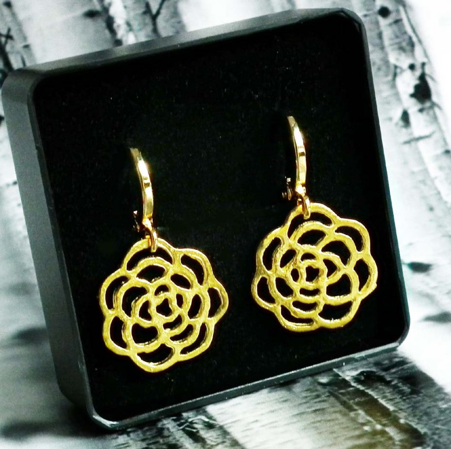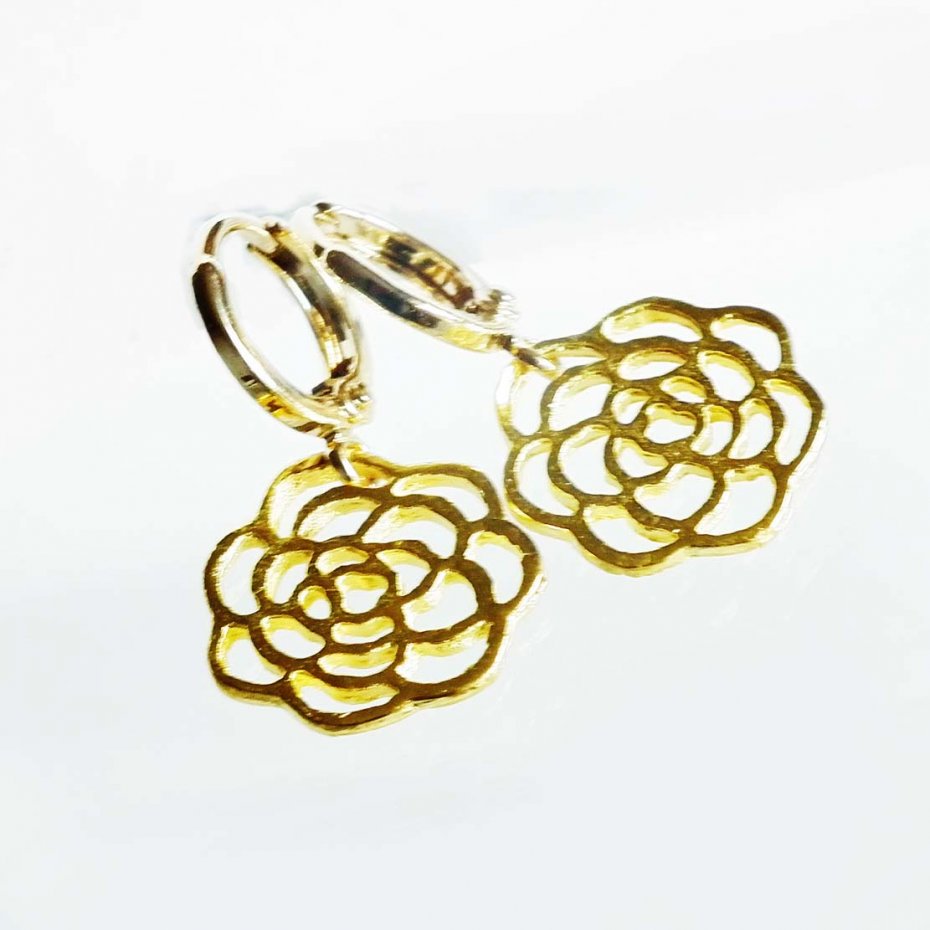 Kwiat metalowy, doskonałej jakości zapięcia - bigle zapinane tzw. kajdanki, pokryte 16 Karatowym złotem, antyalergiczne.