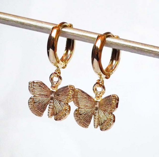 Delikatne i jednocześnie efektowne kolczyki z motylami. Zawieszki motyle metalowe w kolorze jasnego złota, zapinane bigle pokryte 16 karatowym złotem - hipoalergiczne.