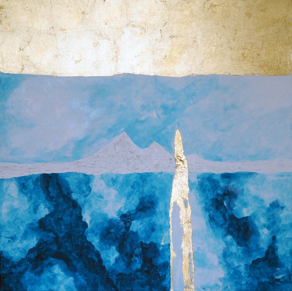 Obraz wykonany farbami akrylowymi z dodatkiem szlagmetalu, który nadaje całości wyjątkowego, luksusowego charakteru. Kompozycja łączy intensywne odcienie błękitu z lśniącymi złotymi akcentami, przywodząc na myśl spokojny horyzont, taflę oceanu i rozświetlone niebo.
