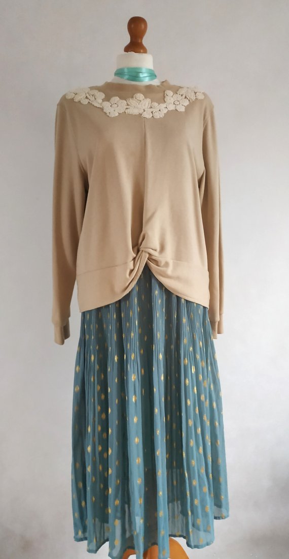 kolor miętowy i złote płatki. materiał jest jak cienka żorżeta, drobno plisowany od góry, plisy ładnie się rozchodzą ku dołowi.Spódnica jest na gumce i ma podszewkę.przez drobne plisowanie wysmukla :-) świetna na cieplejsze dni, ale tez do swetrów i kozaków.