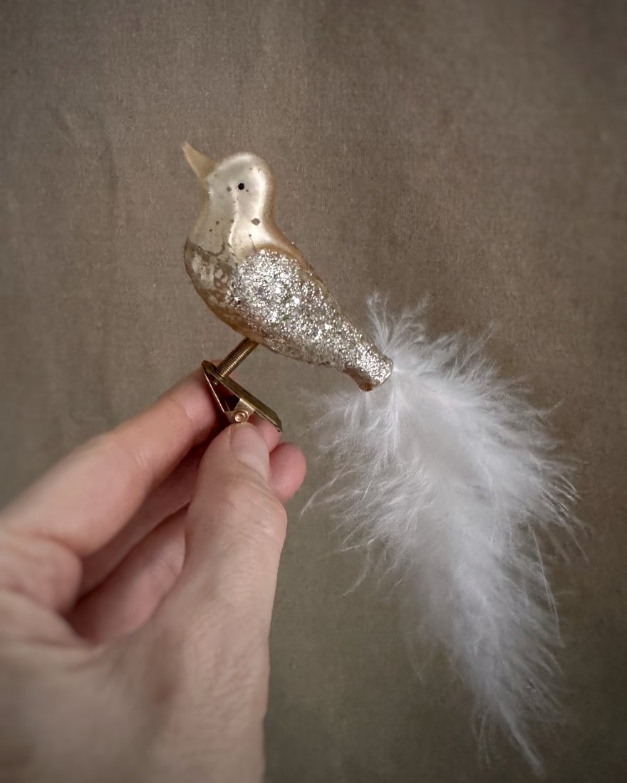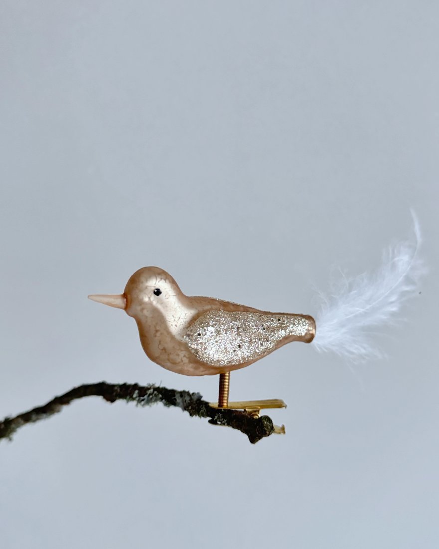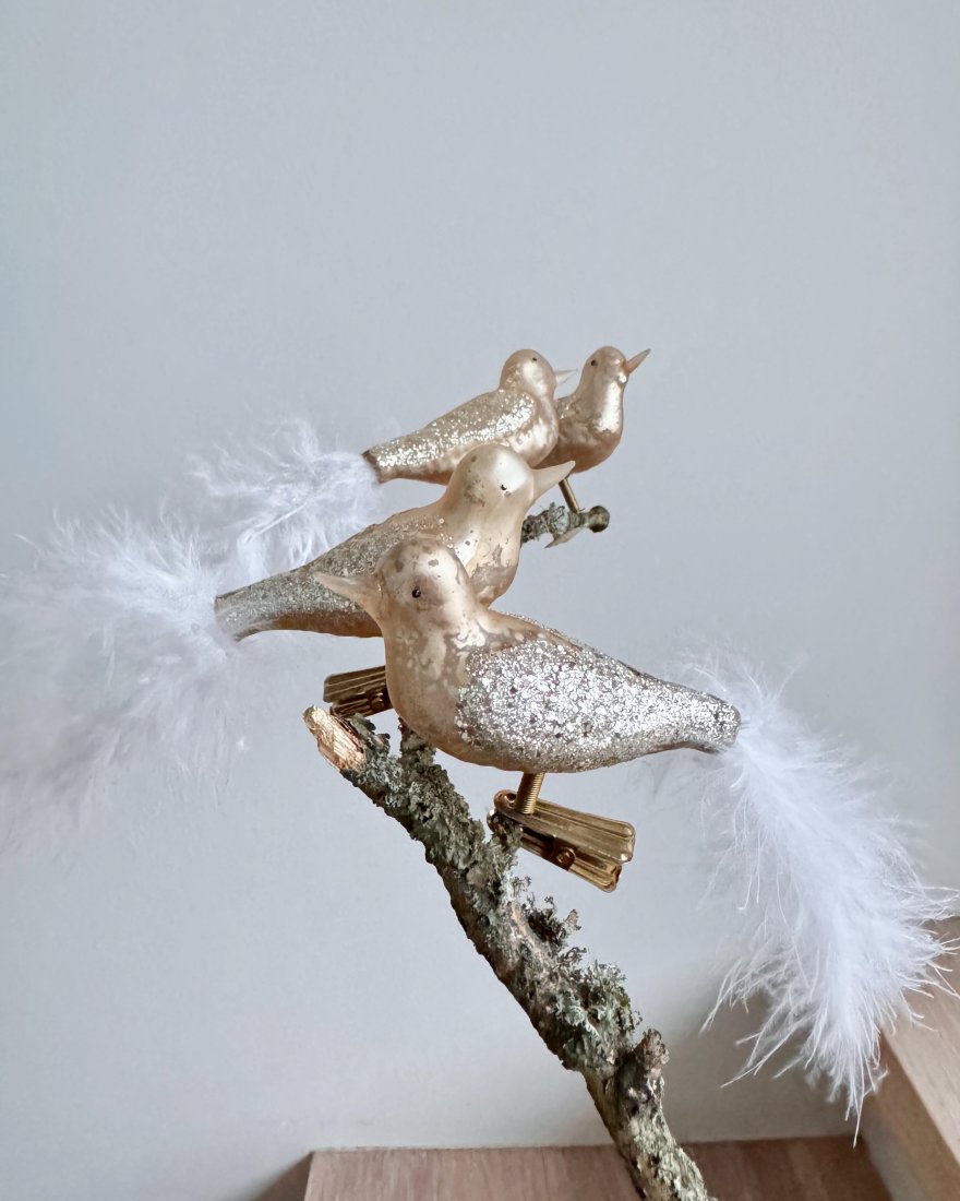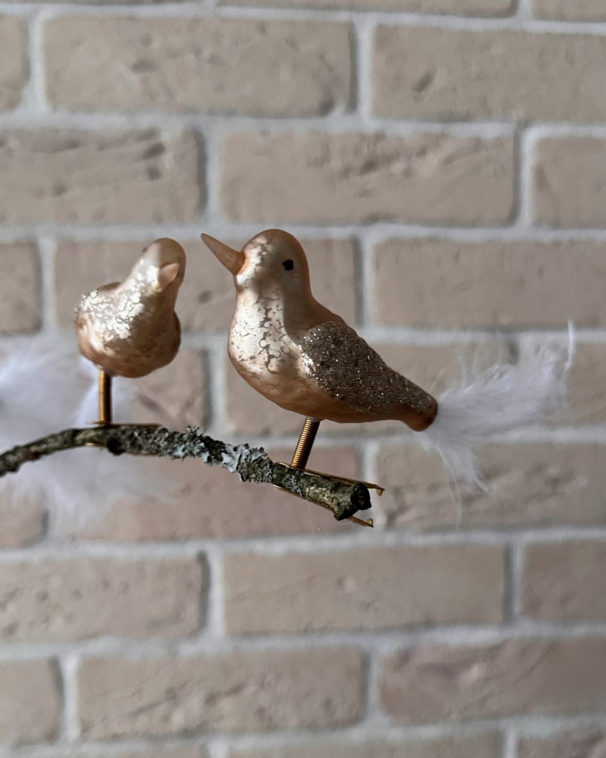 Ozdoby świąteczne na choinkę i nie tylko w kształcie ptaszków. Ptaszki są szklane, ręcznie malowane na kolor złoty, z brokatem, mają ogonki z piór a zaczepia się je na ‚żabki’.