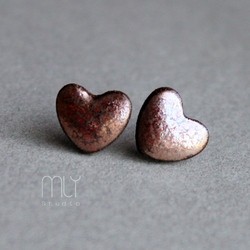 Ceramiczne kolczyki w formie sztyftów, ręcznie wykonane z delikatnej gliny kamionkowej, jednostronnie szkliwione złotobrązowym szkliwem z efektem plamek i pięknym metalicznym połyskiem, na sztyftach w kolorze srebrnym.Średnica ok. 12mm.. Polecam