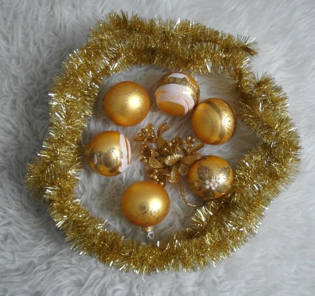 6 szt.o średnicy 6 cm, są to polskie bombki ręcznie robione w oryginalnym pudełku. do tego złota zawieszka w kształcie choinki i złoty puszysty łańcuch.