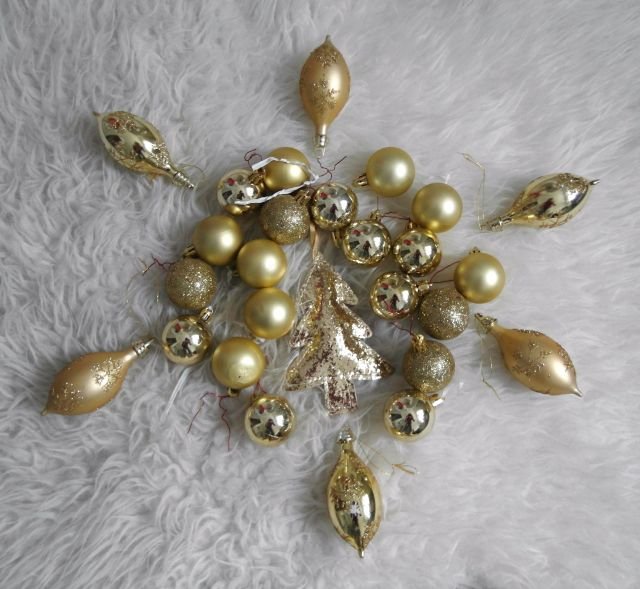złote bombki w różnych odsłonach i wielkościach - 32 sztuki