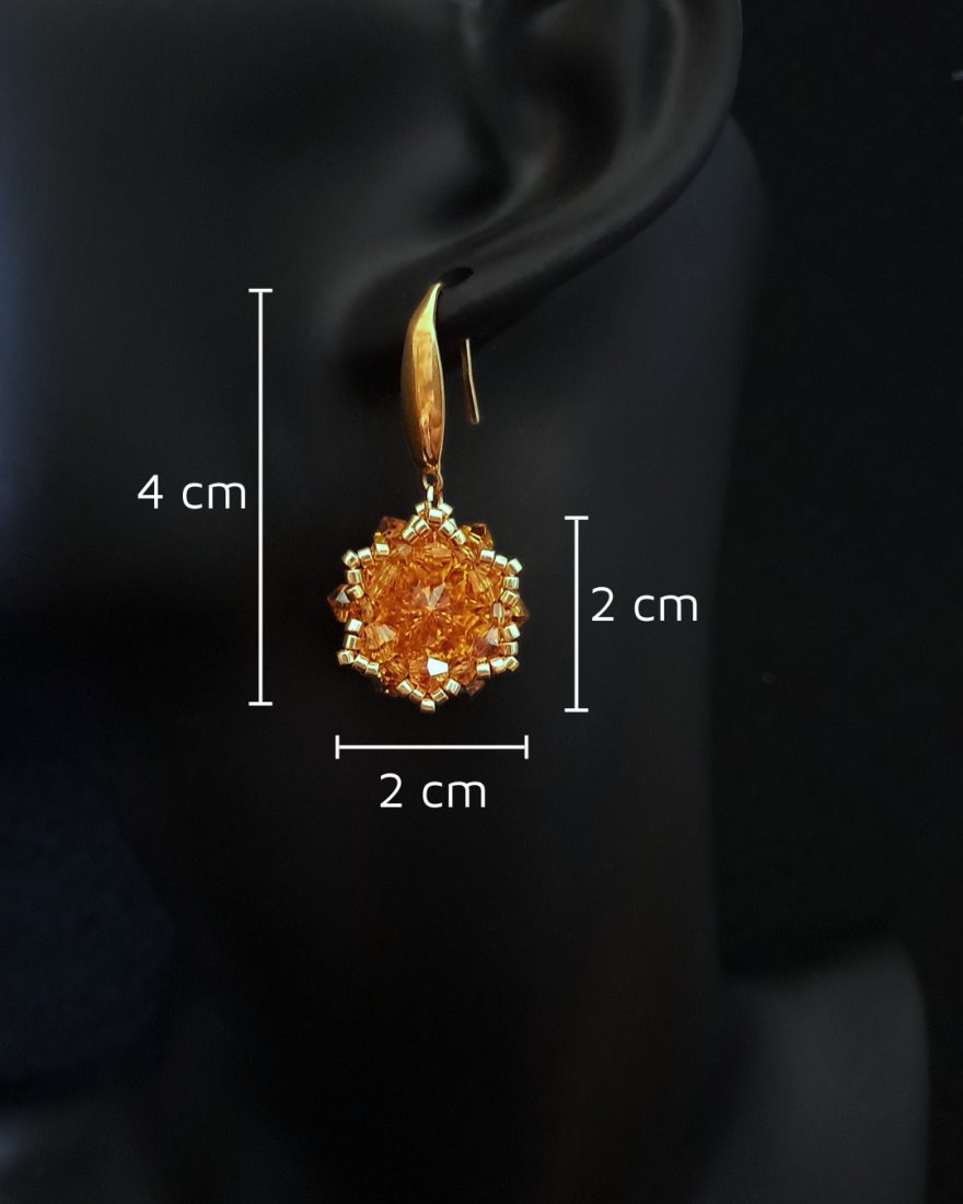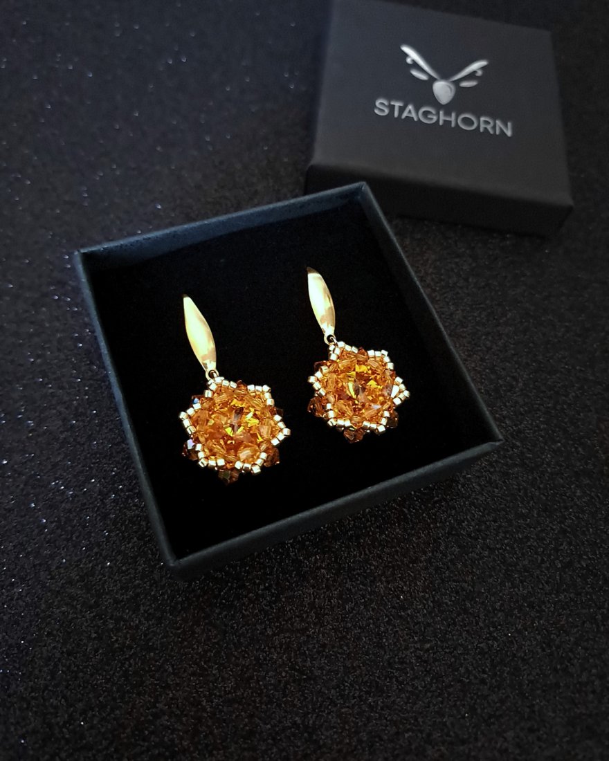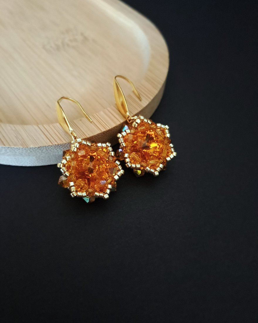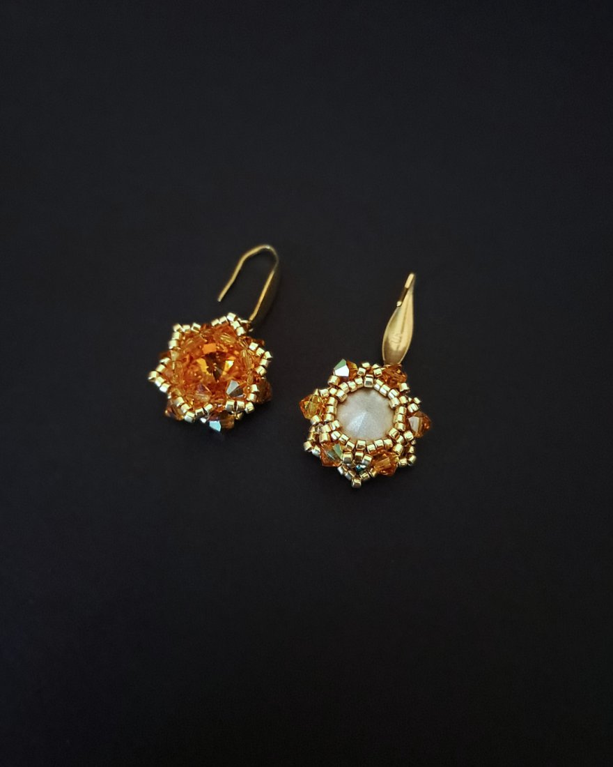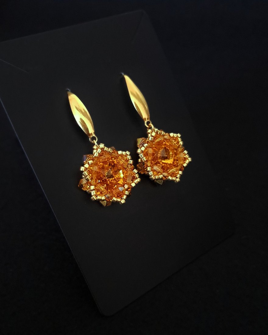 Ręcznie wykonane z kamieniem Preciosa Rivoli Maxima 14 mm w kolorze topaz, otoczonym kryształkami Preciosa Bicone w odcieniach Topaz AB i Topaz oraz złotymi koralikami Miyuki Delica. Ciepła, bursztynowa tonacja pięknie odbija światło przy każdym ruchu, dodając elegancji zarówno codziennym, jak i wieczorowym stylizacjom.