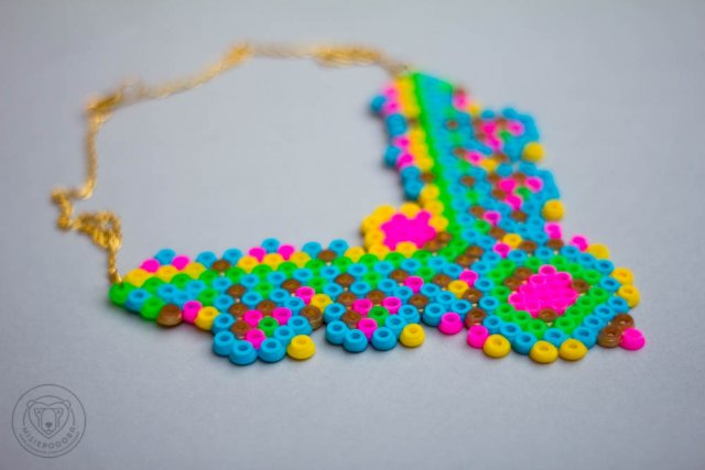 Kolia z nonszalanckim luzem i młodzieńczym charakterem. Wygląda efektownie, oryginalnie i daje duże pole do modowych eksperymentów. W doskonały sposób ożywi również proste stylizacje. Kolia wykonana z plastikowych koralików, zgrzanych na ciepło. Długość z łańcuszkiem 28,5 cm. Łańcuszek z zapięciem w kolorze złota.