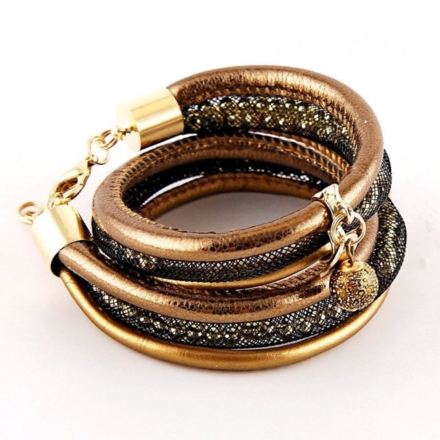 Jest jest wykonana z elastycznej czarnej siateczki, która jest wypełniona drobnymi kuleczkami w kolorze złotym oraz dwóch szytych rzemieni w różnych odcieniach złota.