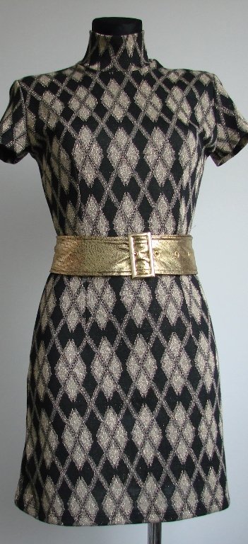 bardzo elegancka, dzianinowa, dopasowana w talii tunika lub mini sukienka, wzór czarno- złote romby( złoto brokatowe, co słabo wyszło na zdjeciu), do tego złoty pasek,