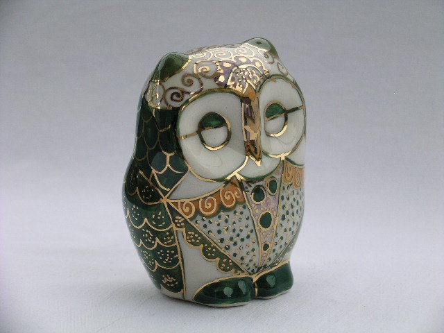 Pięknie ręcznie malowana porcelanowa sowia figurka - fantastyczne, bogate spotkanie kolorów i precyzja piórkowego złocenia z polotem. Błyszczące szkliwienie. Wielce dekoracyjna, z osobowością :) 6,5 x 5,5 x 8 cm. Stan zachowania bardzo dobry.