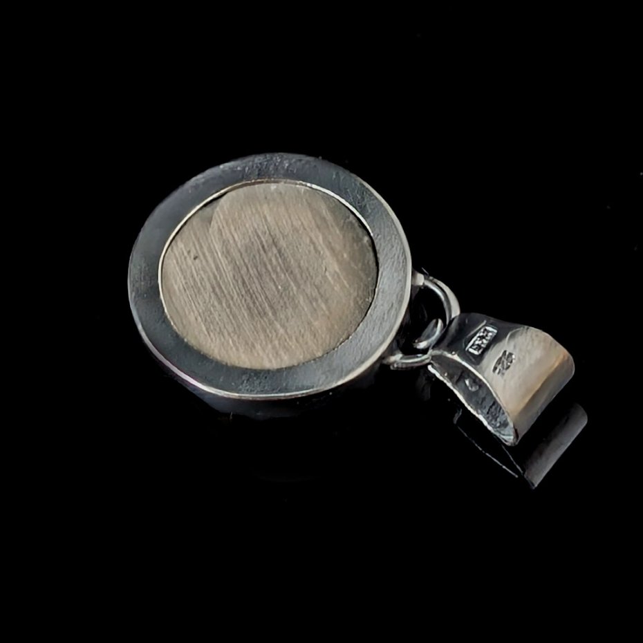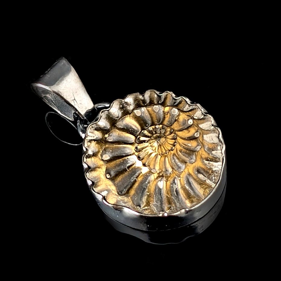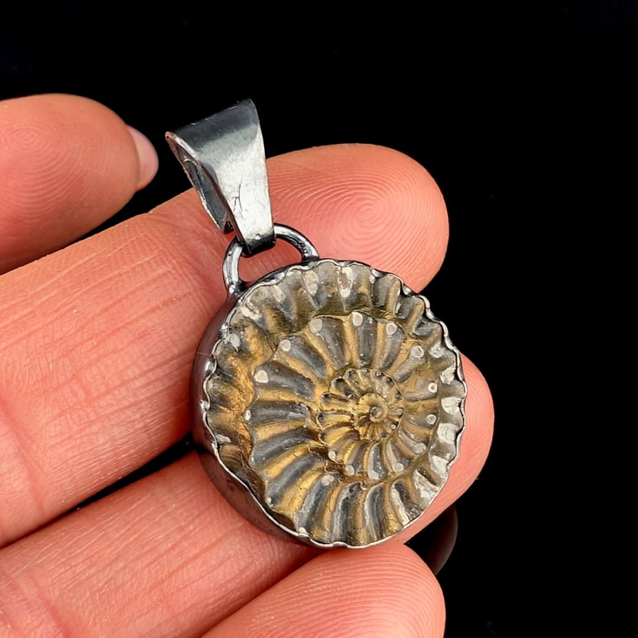Piękny, oryginalny wisior wykonany własnoręcznie z oksydowanego srebra próby 925 oraz niezwykłego okazu skamieniałości- naturalnego odcisku amonitu. średnica wisiora 20 mm. Długość z krawatką 32 mm. Waga wisiora 6 g. Wisior zostanie zapakowany w ozdobne pudełeczko.