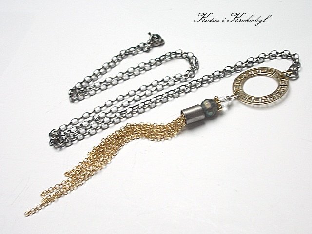 Długi naszyjnik wykonany w całości ze srebra i srebra pokrytego 24k zlotem [pr.925] w połączeniu z fasetowanym labradorytem mystic [6mm] oraz chwostem z łańcuszków [9,5cm] fasetowanymi kuleczką labradorytów mystic [4mm], fasetowaną kuleczką kryształu górskiego [4mm] . Srebro częściowo oksydowane i przetarte. Całkowita długość łańcuszka [bez wiszącej części] 61cm. Długość wiszącej części około 12cm. Biżuteria ozdobnie zapakowana