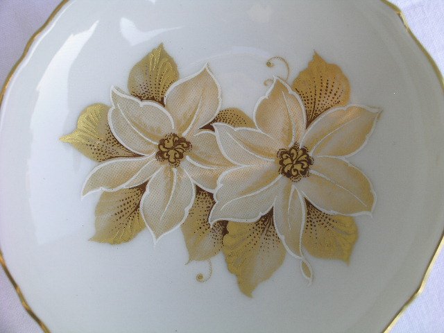 Piękny, filigranowy i szlachetnie porcelanowy talerzyk z kwiatowym zdobieniem, złocony, z precyzyjną delikatną malaturą, sygnowany jakością Kaiser. Półgłęboki kształt, doskonały na drobną biżuterię przy kobiecej celebracji. Rant falbanowany, złocony. 8 x 2,2 cm. Stan zachowania bardzo dobry. Cudo elegancji :)