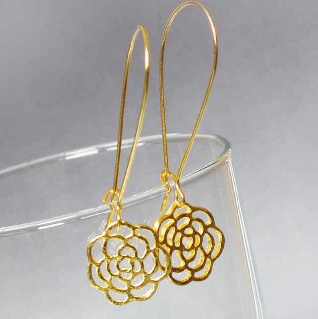Delikatne średniej długości kolczyki ze złotym ażurowym kwiatem na biglu.