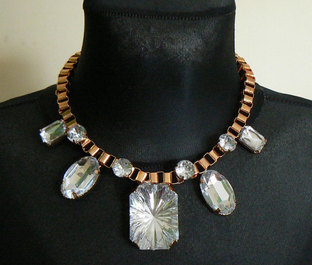 Naszyjnik z metalu w kolorze złota, z dużymi akrylowymi kamieniami. Zapinany na karabińczyk z łańcuszkiem regulacyjnym.
