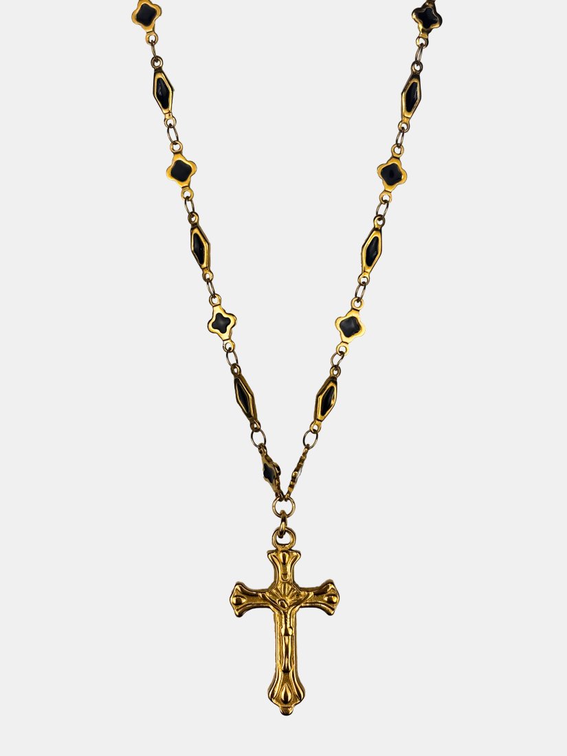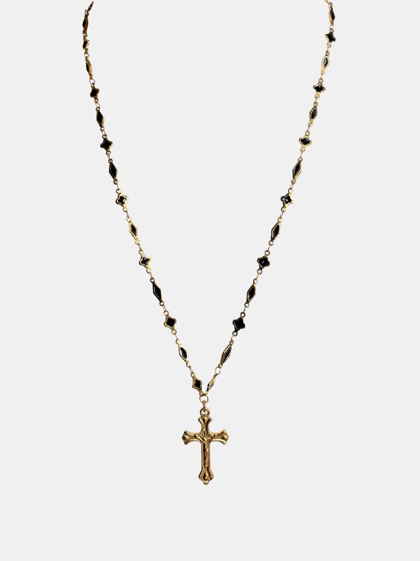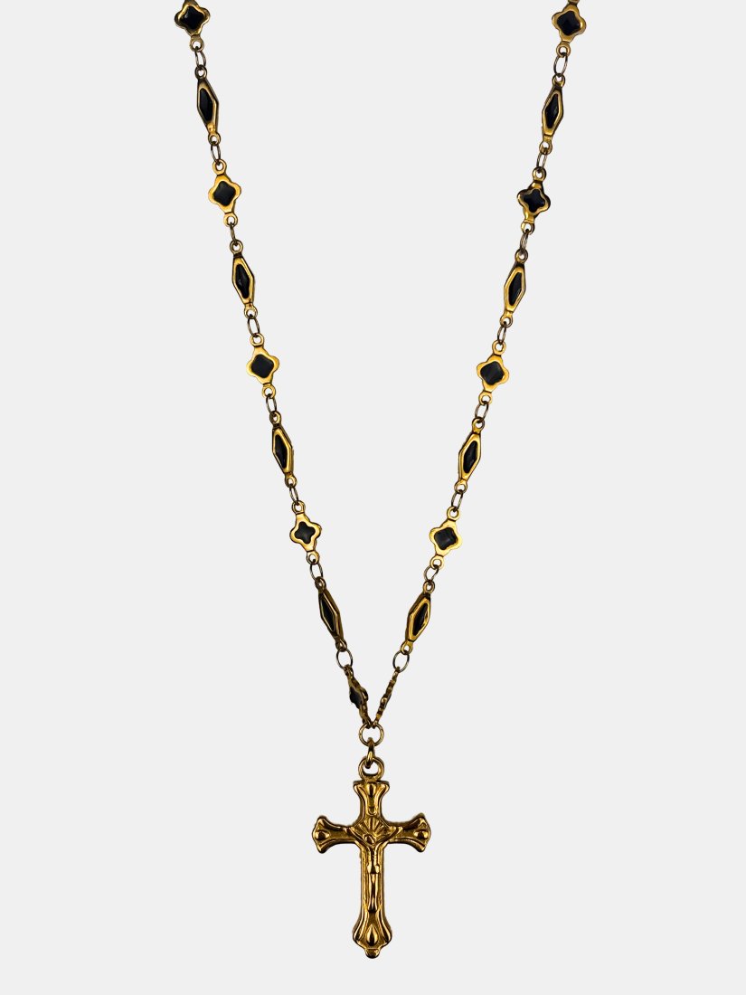 Efektowny i bogato zdobiony naszyjnik, charakteryzujący się misternymi czarnymi ogniwami łańcuszka, emanuje wiktoriańską i mroczną romantyczną estetyką, przywodzącą na myśl barokowe różańce. Połączenie czerni i złota odzwierciedla alchemię transformacji, gdzie złoto symbolizuje oświecenie, a czerń oznacza nieznane. Naszyjnik ten symbolizuje równowagę między światłem a ciemnością. Długość łańcuszka i jego delikatny design sprawiają, że idealnie nadaje się do noszenia w połączeniu z innymi naszyjnikami.