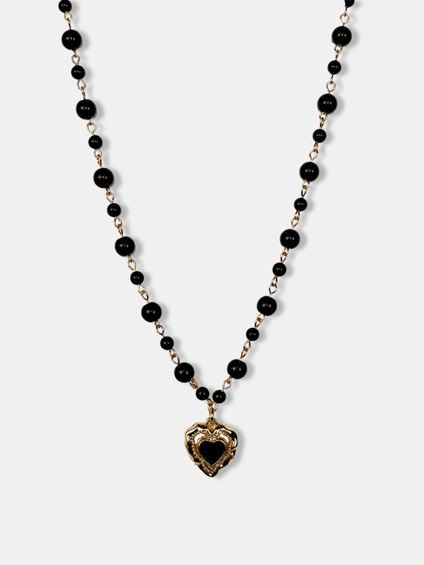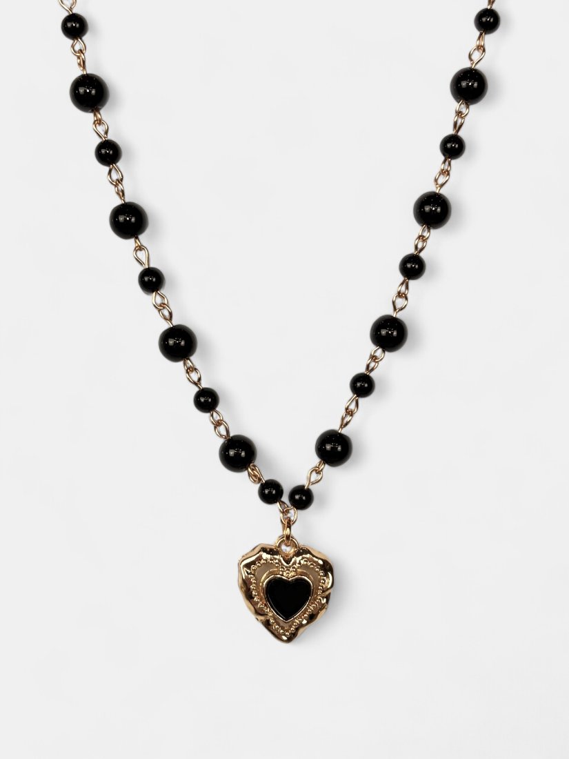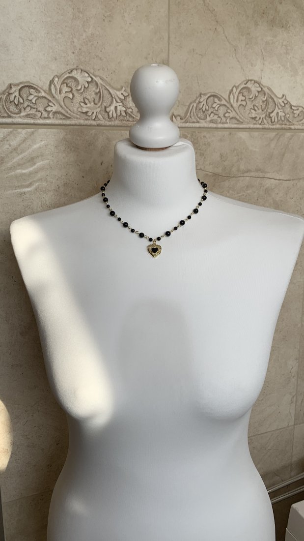 Naszyjnik typu luźny choker, który emanuje mroczną kobiecością. Ozdobiony odważnym czarnym onyksem i agatem oraz delikatnym złotym barokowym sercem, w delikatnym stylu gotyckim.