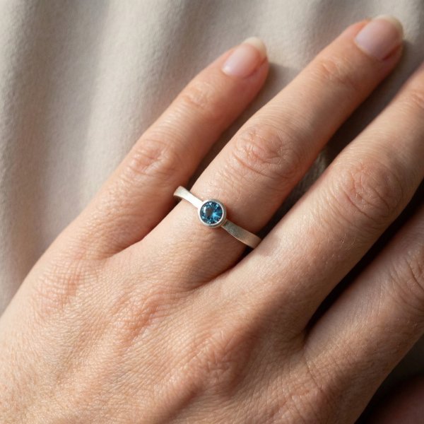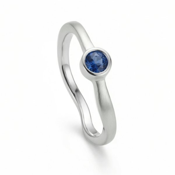 Delikatny pierścionek zaręczynowy z białego złota próby 0,585 z naturalnym szafirem. Szerokość szyny pierścionka waha się między 2 a 3 mm. Jego zewnętrzna powierzchnia jest piaskowana a wewnętrzna wypolerowana. 4 mm szafir to kamień szlachetny symbolizujący wierność, mądrość, prawdę i trwałość uczuć, często nazywany "kamieniem królewskim". Do produktu dołączony jest certyfikat. Proszę podać swój rozmiar jubilerski lub średnicę wewnętrzną pierścionka po złożeniu zamówienia.