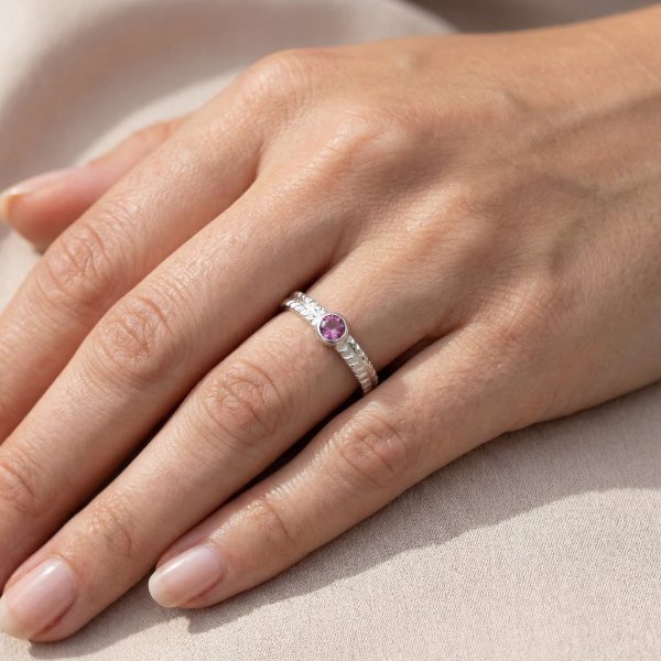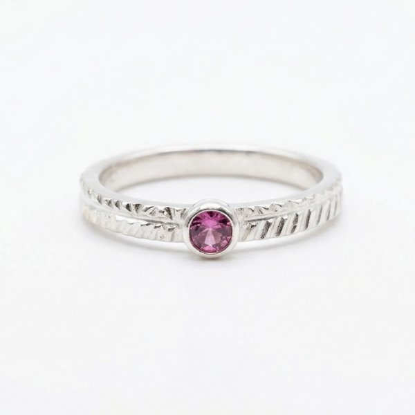 Delikatny pierścionek zaręczynowy z białego złota próby 0,585 z różowym turmalinem. Pierścionek jest szeroki na 2 mm. Jego powierzchnia jest wypolerowana. Turmalin jest znany z właściwości uziemiających, równoważy emocje, wspiera regenerację i przynosi stabilność. Do produktu dołączony jest certyfikat. Proszę podać swój rozmiar jubilerski lub średnicę wewnętrzną pierścionka po złożeniu zamówienia.