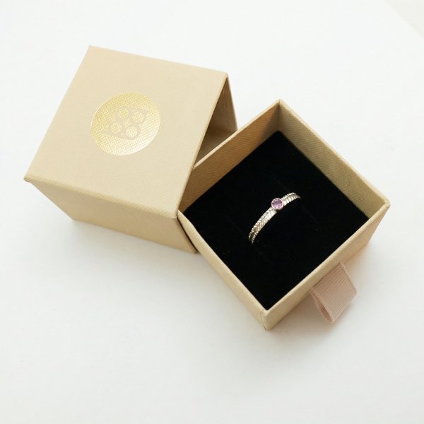 Unikatowa biżuteria wykonana jest ręcznie z najwyższą dbałością o detale i wraz z dowodem zakupu zapakowana w eleganckie firmowe pudełko. Damy o ekologię: całość opakowania biżuterii jest wykonana z papieru. Każdy pierścionek ma wybitą próbę stopu metalu szlachetnego, z którego jest wykonany oraz imiennik autorki (bw.).
