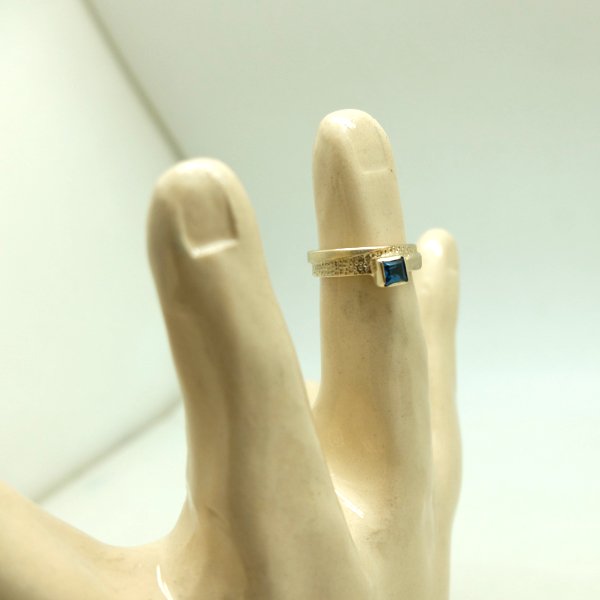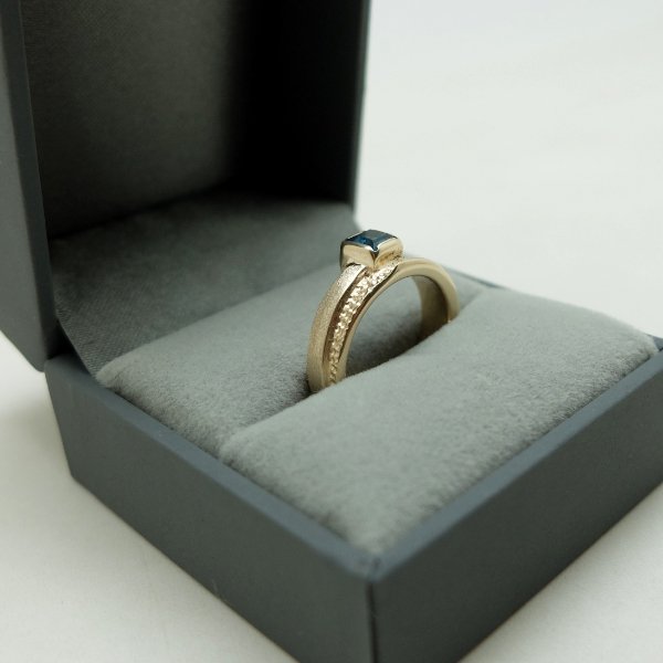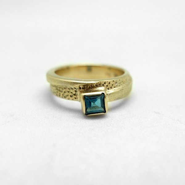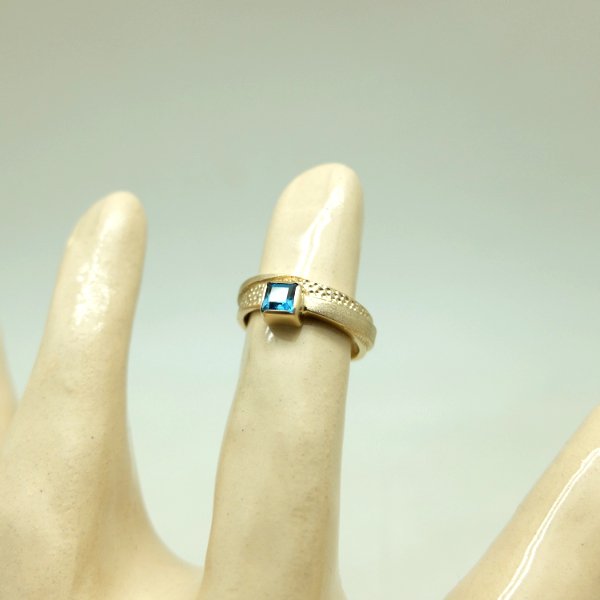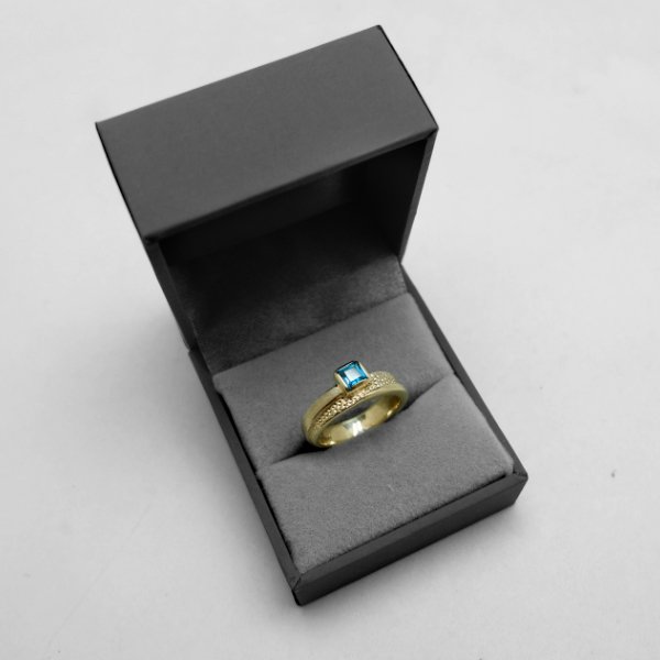 Pierścionek z żółtego złota próby 0,585 z kwadratowym topazem London o boku 4 mm. Pierścionek jest szeroki na 6 mm. Jego powierzchnia jest delikatnie satynowana na zewnątrz i polerowana wewnątrz. Do produktu dołączony jest certyfikat autentyczności.