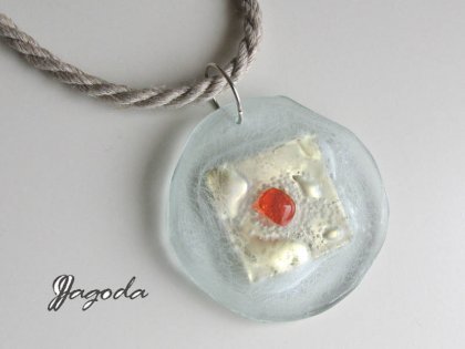 Ciekawy szklany wisior w kształcie koła ze złotym elementem w środku. Szkło o średnicy ok.4cm grawerowane, z pomarańczową kropelka na środku. Wisior zawieszony na długim sznurku.