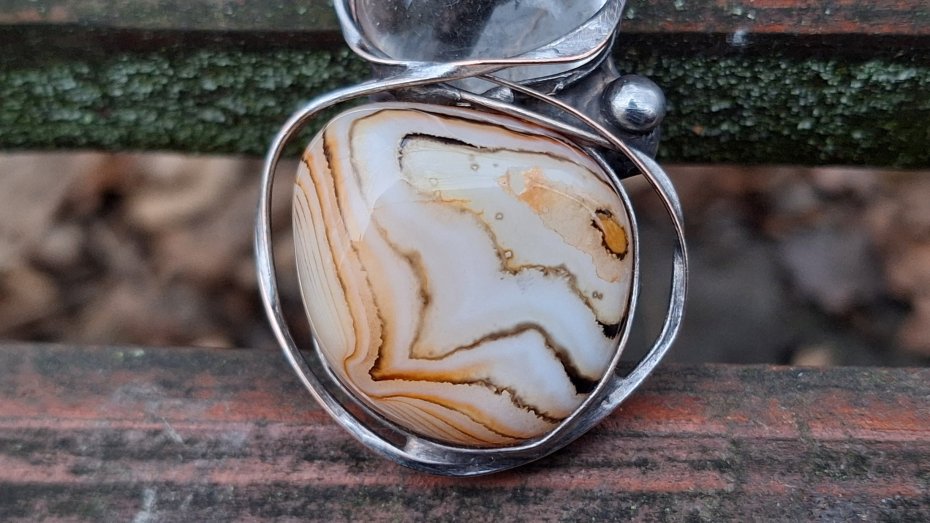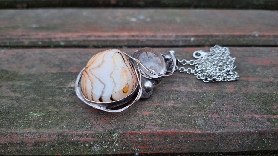 Wisiorek wykonany z miedzi, cyny, kryształu górskiego i naturalnego agatu. Wymiary ok. 5 na 3.5 cm. Zawieszony na łańcuszku o długości ok. 50 cm.