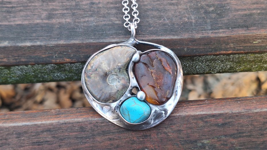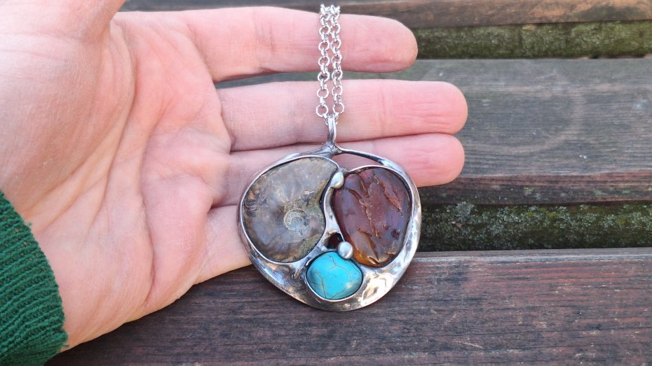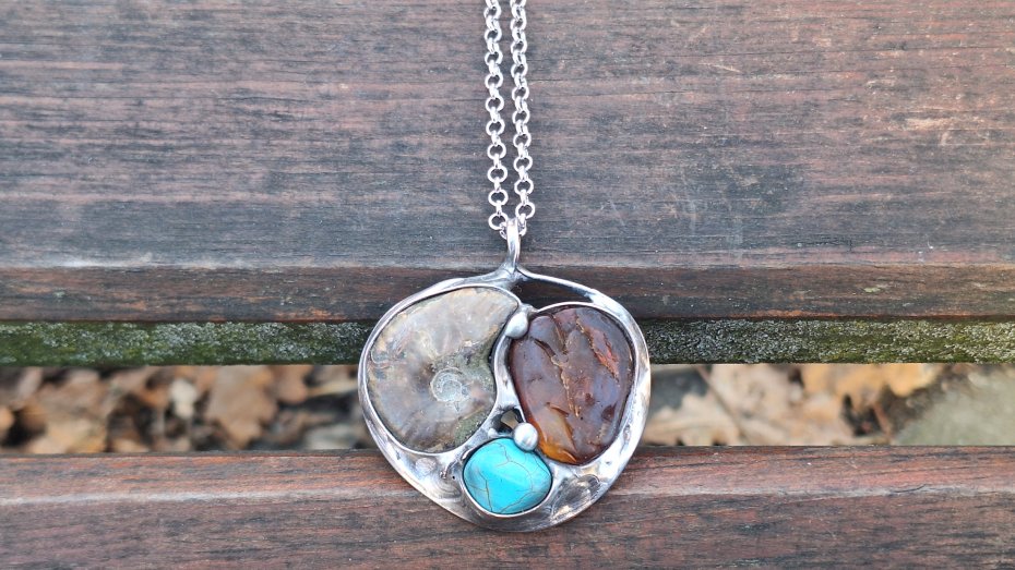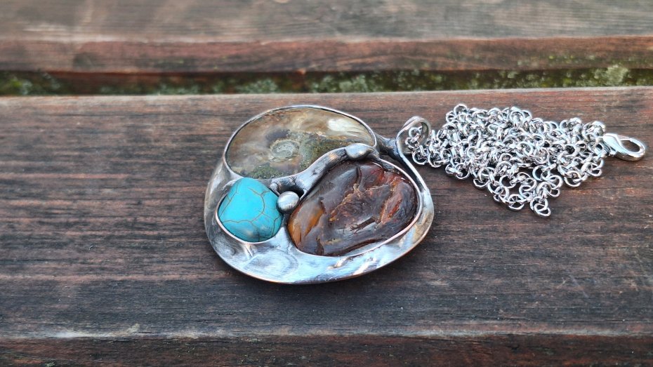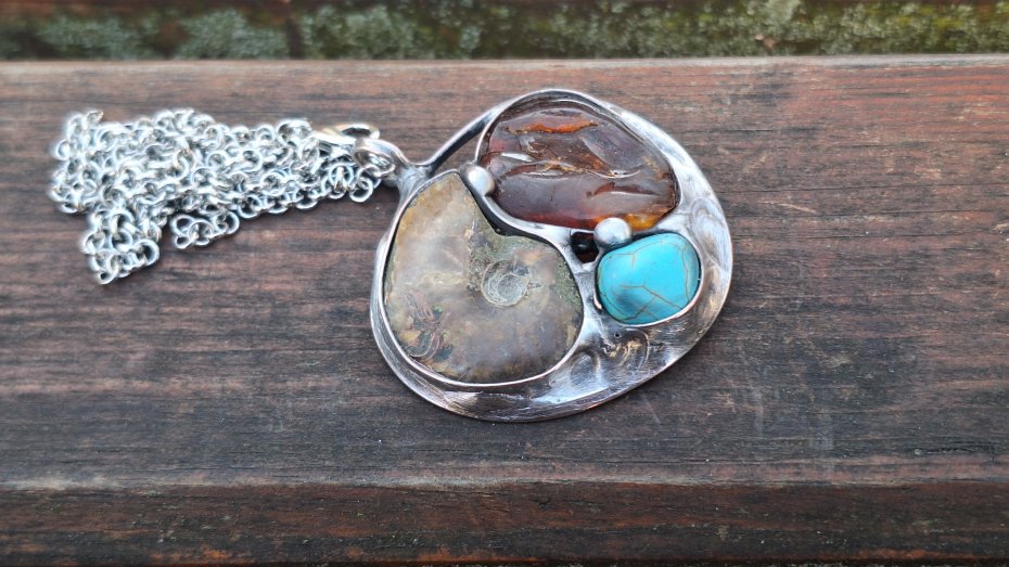 Wisiorek wykonany z miedzi, cyny, howlitu, amonitu i bursztynu. Wymiary ok. 4.5 na 5 cm. Zawieszony na łańcuszku o długości ok. 50 cm.