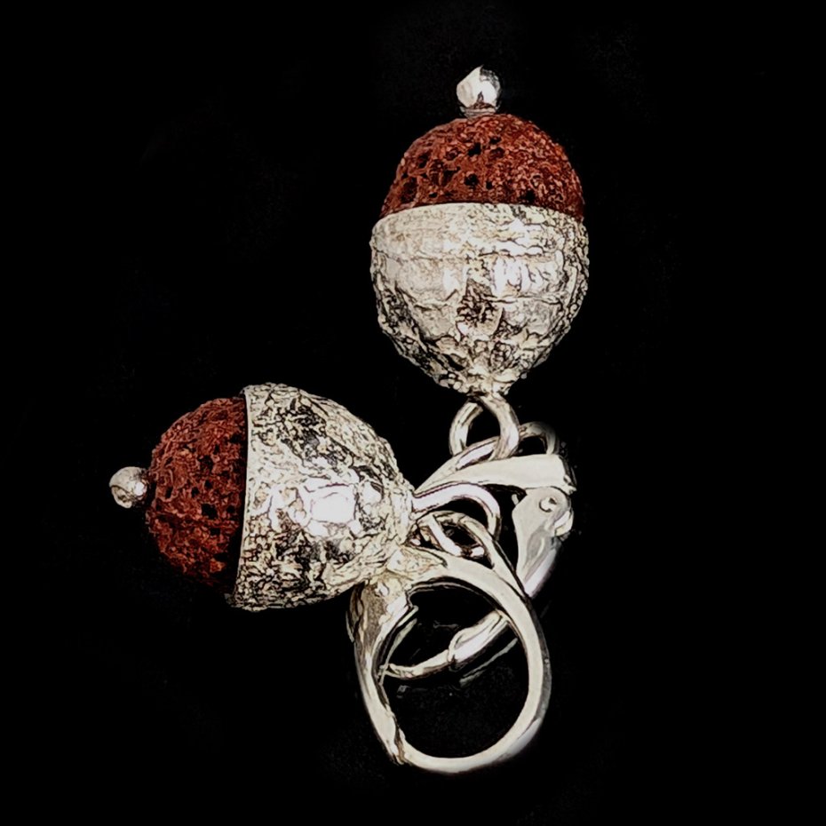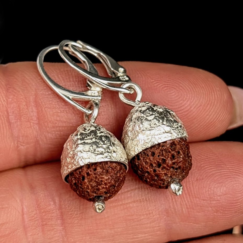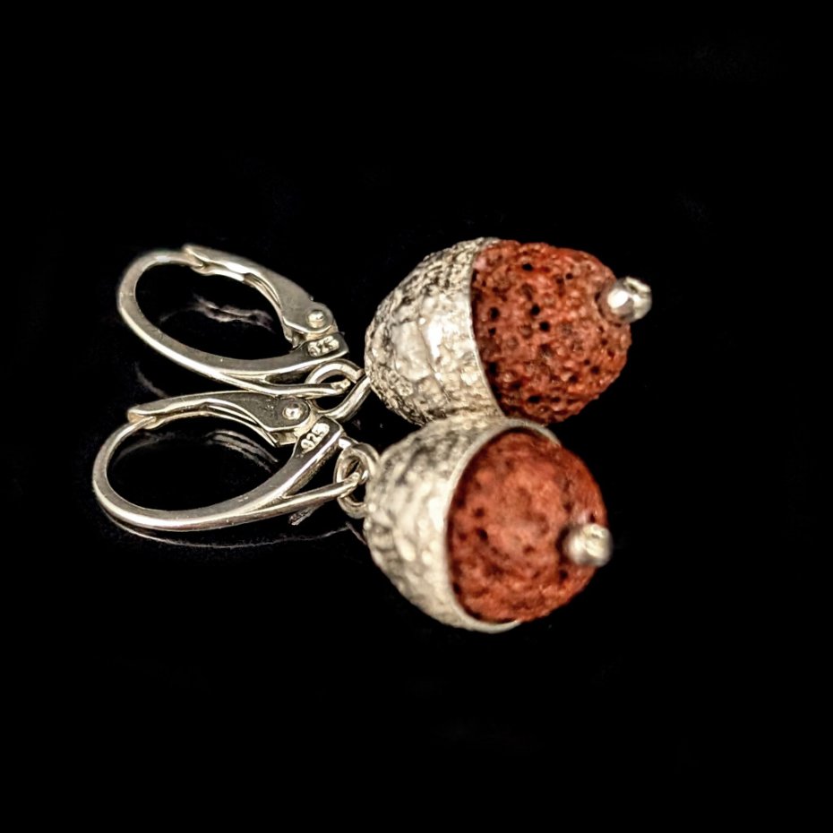 Kolczyki wykonane ze srebra próby 925 oraz lawy wulkanicznej. Czapeczki dębowe wykonane ze srebra. Długość kolczyków z angielskimi biglami 37 mm. Średnica w czapeczce 11 mm. Waga jednego kolczyka 3,3 grama. Zostaną zapakowane w ozdobne pudełeczko.
