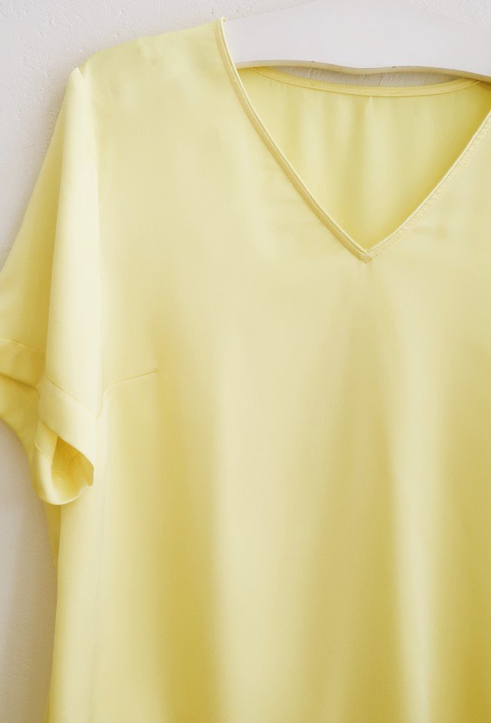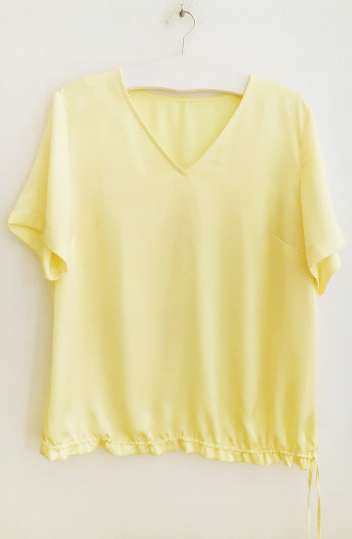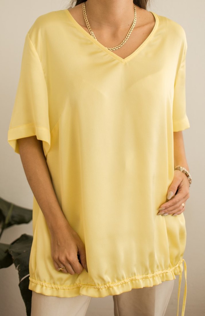 Żółta bluzka satynowa z lekkim marszczeniem na dole.