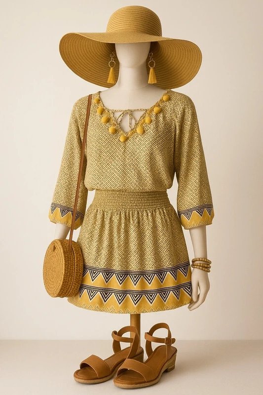 Tunika vintage w ciepłych odcieniach żółci i brązu, ozdobiona geometrycznym wzorem. Przy dekolcie sznurowane wiązanie z żółtymi chwostami dodaje lekkości i oryginalnego charakteru.