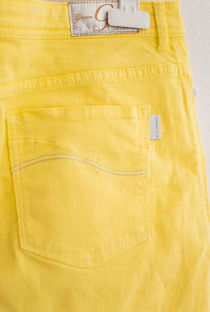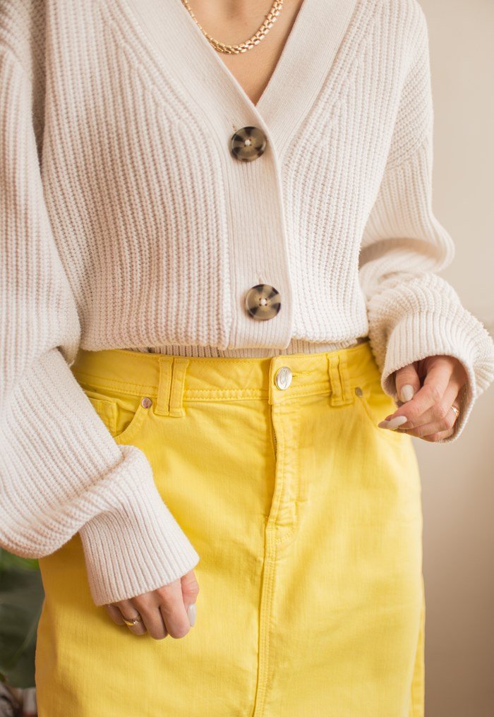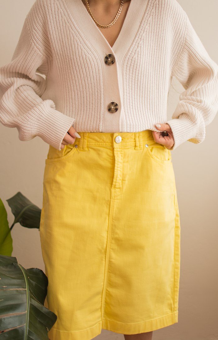 Żółta spódniczka jeansowa.
