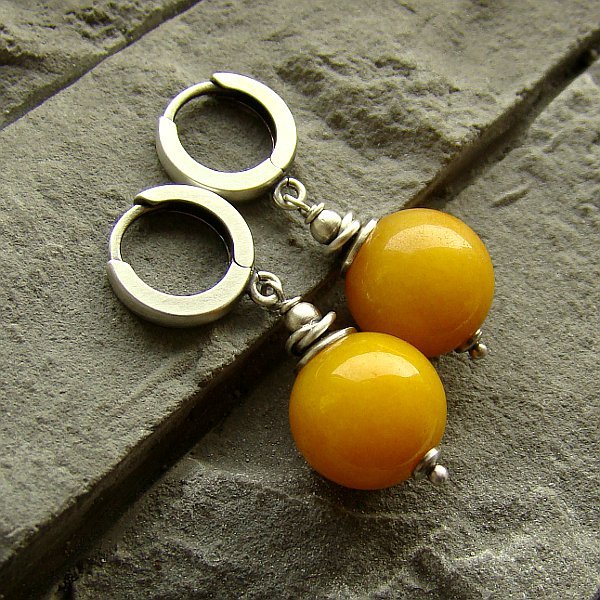 Proste, minimalistyczne kolczyki na co dzień. Wykonane w całości z oksydowanego srebra próby 925 oraz kul jadeitu o głębokim, żótym kolorze wielkości 1,2 cm. Długość całkowita to 3,5 cm. Bigle typu kajdanki. Ozdobnie zapakowane.
