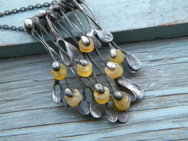 Naszyjnik z półsurowych opali w ocynowanej miedzi. wymiary zawieszki 6,5cm x 4,1cm. łańcuszek z posrebrzanej, oksydowanej miedzi z zapięciem z oksydowanego srebra o długości 49cm