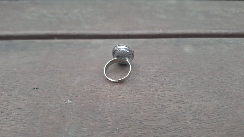 Pierścionek wykonany z miedzi, cyny i jadeitu. Wymiary ok. 2 na 1.5 cm. Regulowany. Nie jest ciężki.